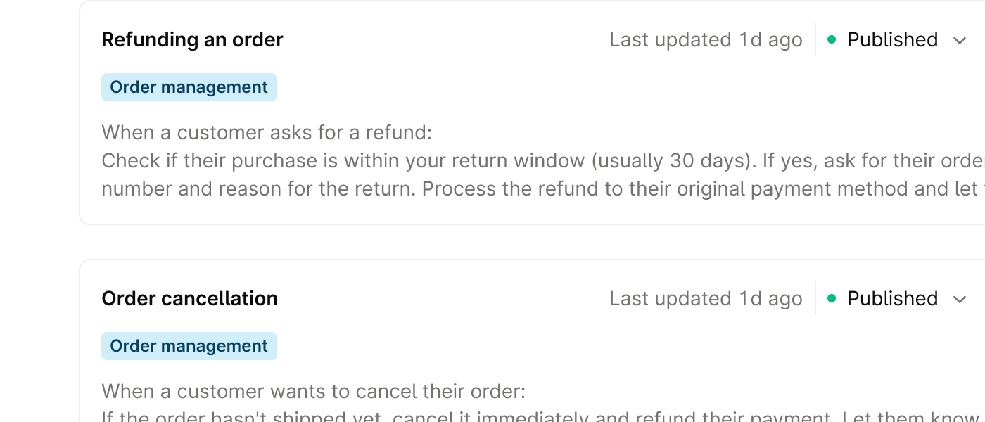 Write plain-English playbooks for handling common scenarios like subscriptions, refunds, cancellations and more.