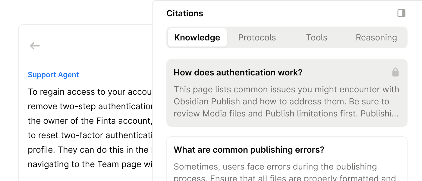Look at any conversation your agent has had with customers and understand its underlying thinking and resources to troubleshoot problems.