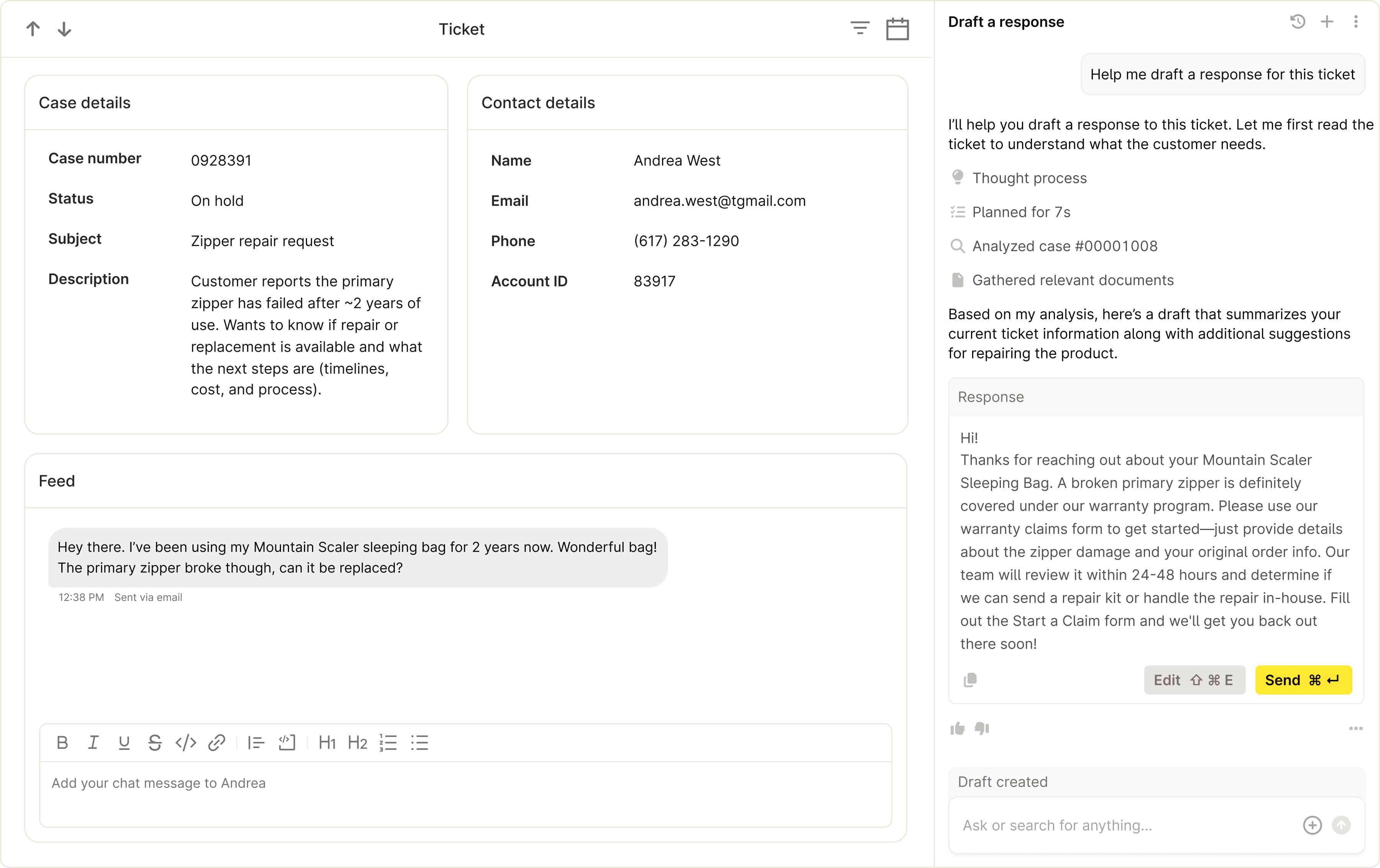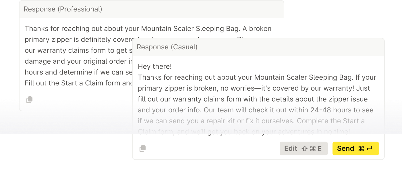 On-brand drafts grounded in your knowledge with citations; edit or send in one click