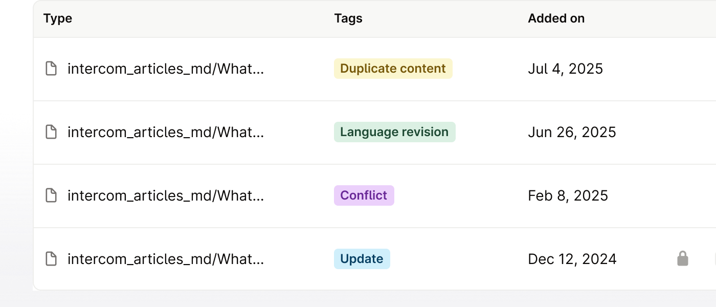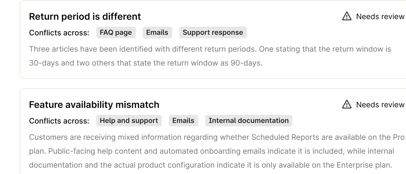 Stale or conflicting content is surfaced and fixed before it spreads.